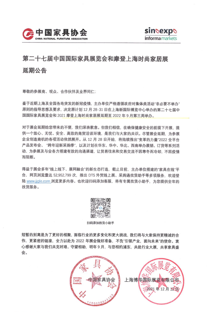 鑒于近期上海及全國各地突發(fā)的新冠疫情,主辦單位嚴格遵循政府對集體類活動“非必要不舉辦”原則的指導思想及要求,決定原計劃12月28-31日在上海新國際博覽中心舉辦的第二十七屆中國國際家具展覽會和2021摩登上海時尚家居展延期至 2022年9月第三周 舉辦。
