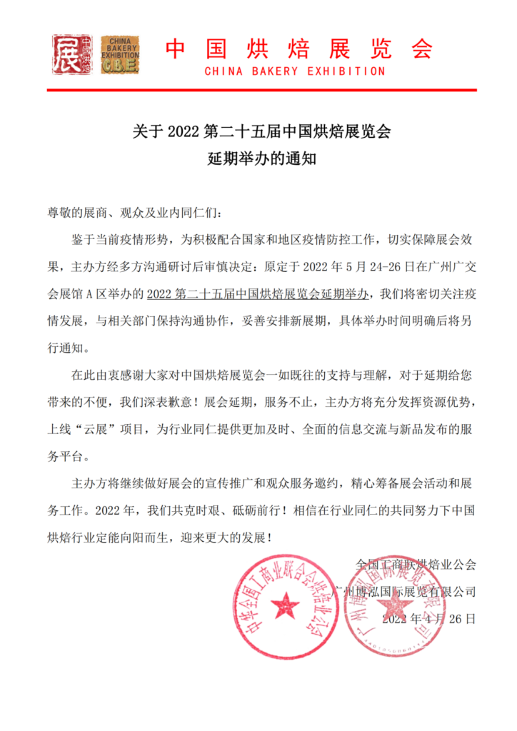 鑒于當前疫情形勢,為積極配合國家和地區(qū)疫情防控工作,切實保障廣大參展商、專業(yè)觀眾及合作伙伴的健康安全和展會效果,主辦方經(jīng)多方溝通研討后審慎決定:原定于2022年5月24-26日在廣州廣交會展館A區(qū)舉辦的2022第二十五屆中國烘焙展覽會延期舉辦。