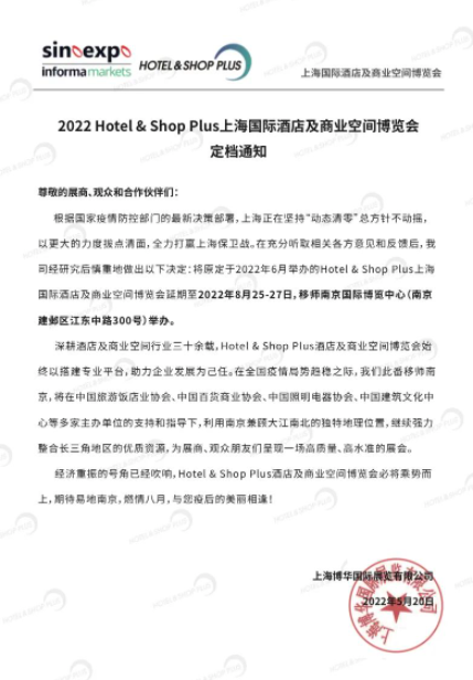 原定于2022年6月舉辦的上海國際酒店及商業(yè)空間博覽會Hotel & Shop Plus將延期至2022年8月25-27日移師南京國際博覽中心舉辦。
