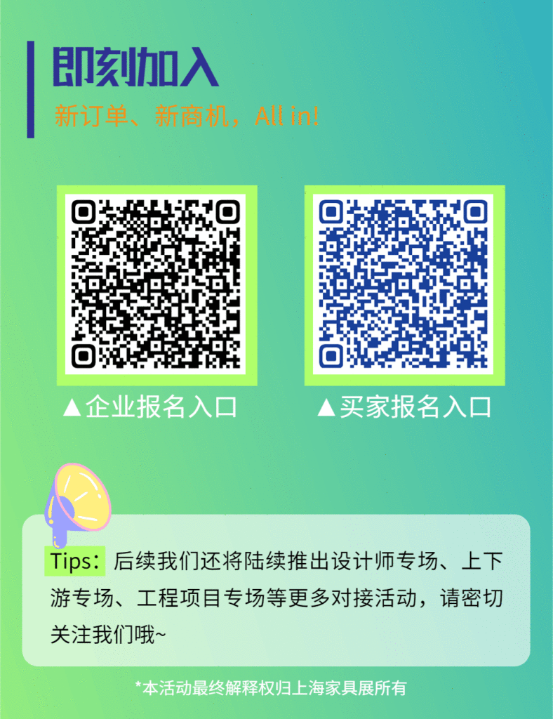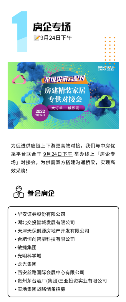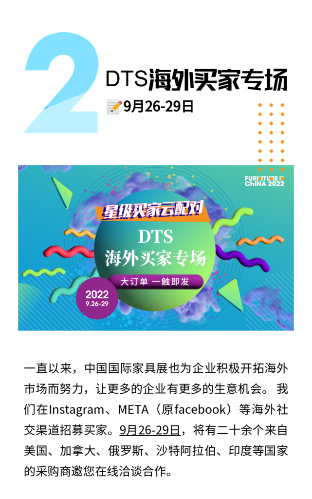 中國國際家具展以推動(dòng)供應(yīng)鏈上下游精準(zhǔn)對接為目的,為企業(yè)和買家搭建專屬高效的洽談合作平臺(tái),促進(jìn)供需雙方聚合聯(lián)動(dòng),實(shí)現(xiàn)抱團(tuán)發(fā)展,攜手共贏。9月24-30日,房企專場,DTS海外買家專場就要來啦!活動(dòng)將采取線上1V1建群和視頻連線方式,企業(yè)和買家可“屏對屏”高效獲取線索和匹配合作意向。