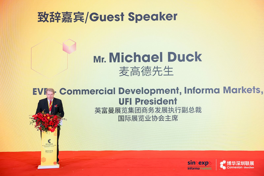 最后由英富曼展覽集團(tuán)商務(wù)發(fā)展執(zhí)行副總裁, UFI國(guó)際展覽業(yè)協(xié)會(huì)主席Michael Duck先生上臺(tái)致辭,他表示英富曼集團(tuán)非常注重在深圳發(fā)展和開(kāi)拓業(yè)務(wù),多年來(lái),集團(tuán)旗下已有數(shù)個(gè)品牌展會(huì)定期在深圳舉行,上海博華國(guó)際展覽有限公司作為英富曼集團(tuán)在中國(guó)的中外合作企業(yè),一直在尋找合適的時(shí)機(jī)來(lái)深圳舉辦展會(huì)的愿望今天終于實(shí)現(xiàn)了,隨著聯(lián)展的推出將進(jìn)一步豐富英富曼集團(tuán)在深圳乃至整個(gè)華南地區(qū)的會(huì)展版圖,也將進(jìn)一步促進(jìn)相關(guān)產(chǎn)業(yè)在粵港澳大灣區(qū)和深圳的貿(mào)易與經(jīng)濟(jì)合作。