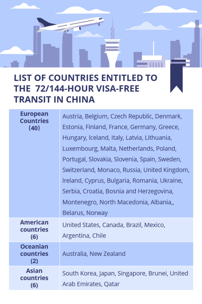 Citizens from the?54 countries?are exempted from visa requirements during transit for?72 or 144 hours?when heading for a third nation,?said the National Immigration Administration.?They are allowed to engage in short-term activities such as travel and business visits during the visa-free stay, it added.