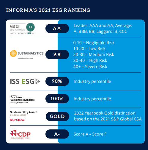 Informa has an AA MSCI ESG Rating, which measures a company’s resilience to long-term, financially relevant environmental, social, and governance risk. We rank in the top 7% of companies in our industry. Informa is included in the DJSI World Index, a FTSE4Good Index Series member and a constituent of the Ethibel Sustainability Index Excellence Europe.